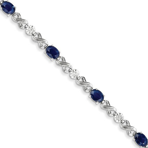 14kt white gold 4 ct tw genuine blue sapphire bracelet has diamond accents and infinity shaped links. Sapphire details: six 7mm x 5.2mm oval genuine heated sapphires. .20 ct tw diamond accents. Lobster clasp. Bracelet length: 7in, link width: 5mm. Rhodium-plated. Weight: 4.3 grams. Import.