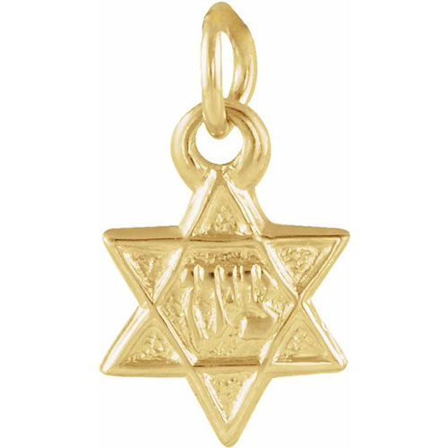 This 14k yellow gold star of David charm is petite, less than half the size of a dime. Dimensions: 7.5x7.0mm. Weighs .38 grams. Please note: weight is approximate, actual weight may vary. Bail size: 1.6mm x 1.25mm; we recommend a chain no wider than 1mm.