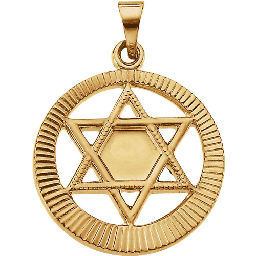This ladies' solid 14k yellow gold round Star of David pendant has a ridged textured border. 17mm diameter. Fits up to a 2.5mm wide chain. Approximate weight: 2.28 grams.