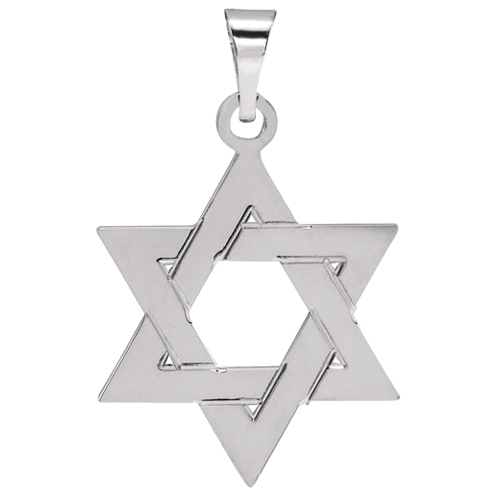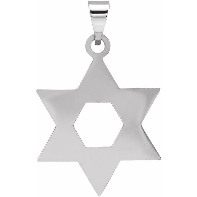 This men's Star of David pendant is made of polished solid 14k white gold. Dimensions: 32mm x 26mm. This pendant is the size of a quarter. Approximate weight: 2.8 grams. Fits up to a 3mm wide chain. Flat back.