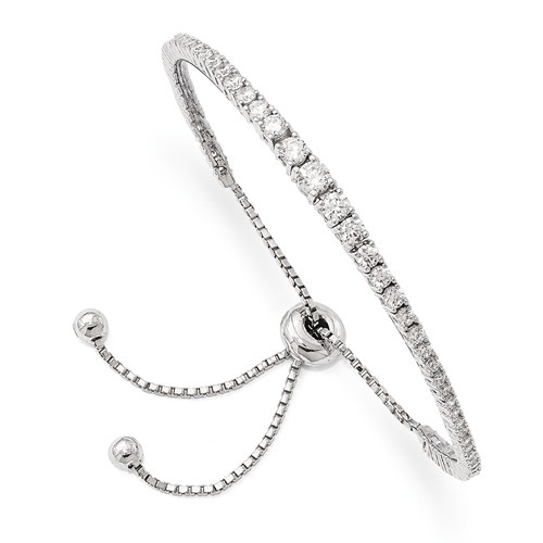 Adjustable cubic zirconia tennis bracelet is made of rhodium plated sterling silver. Adjustable from 5in to 9in. 189 round cubic zirconias decorate this bolo bracelet. Box link chain and ball tips. Weight: 6.1 grams. Import.
