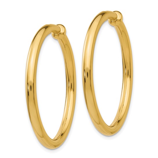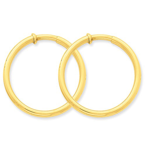 These large round non-pierced tube hoop earrings are made of polished 14kt yellow gold. Diameter: 1 3/8in. Thickness: 3mm. Hollow. Weight: 5.4 grams. Made in Turkey. Ships from USA.