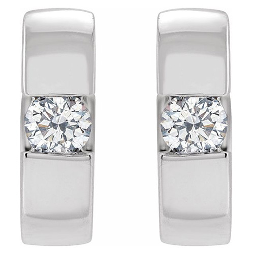 Elevate your everyday style with these 14k white gold diamond hoop earrings. Each earring features a single round diamond set in a small round hoop design, adding subtle glamour to any look. 14k white gold hinged hoop earrings feature two round full cut diamonds, .25 carat total weight, color G-H, clarity: I1. Earring size: 1/2in. Earring thickness: 3.2mm. Wire and clutch closure. These small huggie style earrings cling closely to the ear. Approximate weight: 3.6 grams. Made in the USA.