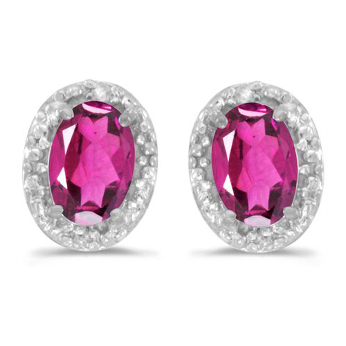 14k white gold .86 ct tw pink topaz oval halo-style post earrings have .02 ct diamond accents. Pink topaz size: 6mm x 4mm. Diamond quality: I2-I3 clarity, I-J color. Friction backs. Weight: 0.8 grams. Made in the USA.