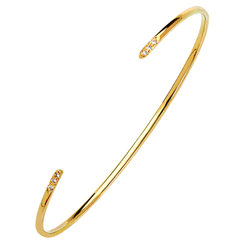 This 1/20 ct tw diamond cuff bangle bracelet is made of 14kt white gold. Six round full cut diamonds, H-I color, I3 clarity, 1.2mm diameter. One size fits most. Weight: 3.9 grams. Import.