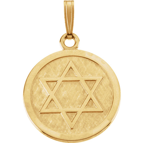 This round Star of David pendant is made of solid 14k yellow gold. Dimensions: 23mm diameter. This item is slightly larger than a nickel. Fits up to a 3mm wide chain. Approximate weight: 5.41 grams.
