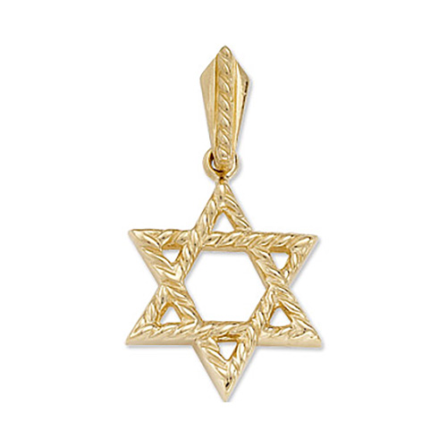 Polished 14kt yellow gold star of David pendant has a braided texture. Dimensions: 19x17mm. This item is the size of a penny. Weighs 3.92 grams. Please note: weight is approximate, actual weight may vary. Chain not included.