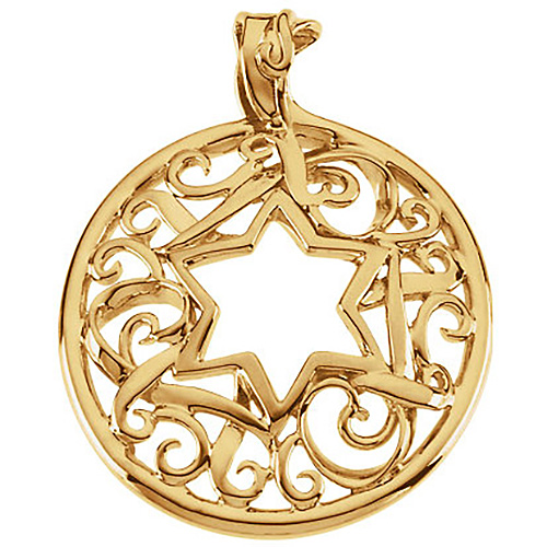 This large round Star of David pendant is made of solid 14k yellow gold. Dimensions: 34mm x 27.5mm including bail. Fits up to a 3.5mm wide chain. Approximate weight: 6.16 grams. Made in USA.