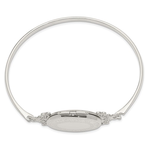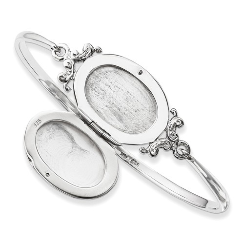 Sterling silver 7in polished fancy oval locket bangle bracelet holds two photos. Locket length: 1in. Flat back. Hook clasp. Weight: 14.5 grams. Made in Thailand.