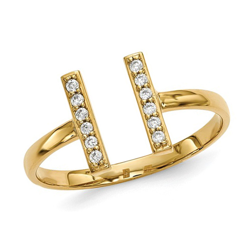 1/10 ct diamond staple ring is made of polished 14kt yellow gold. Diamond details: 12 round diamonds, G-H color, I1 clarity.. Item weight: 1.8 grams. Made in USA.