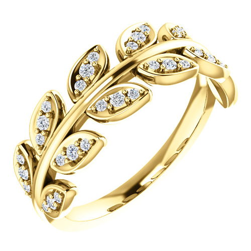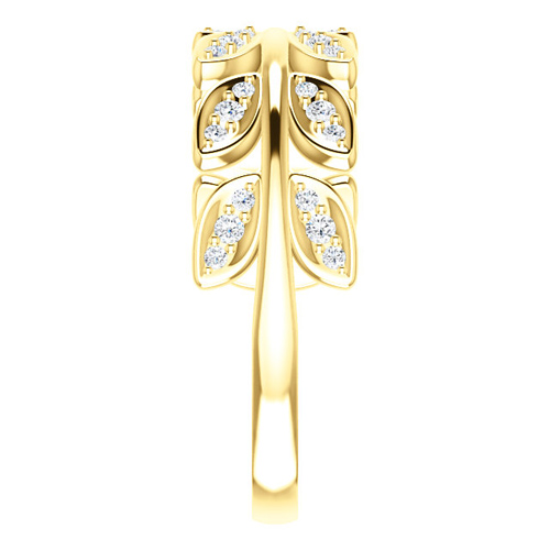 .25 carat total weight diamond leaf ring is made of 14kt yellow gold. 36 round diamonds, I1-I2 clarity, G-H color. Prong set. Ring top width: 8.5mm. Palm width: 2mm. Closed back, standard fit. Approximate weight: 4.1 grams. Made in the USA.