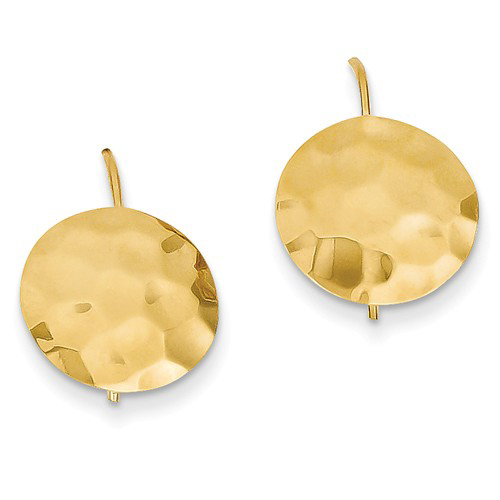 These dainty 14k yellow gold hammered circle earrings have kidney wires. Diameter: 1/2in. Weight: 1.1 grams. Made in Puerto Rico. Ships from USA.