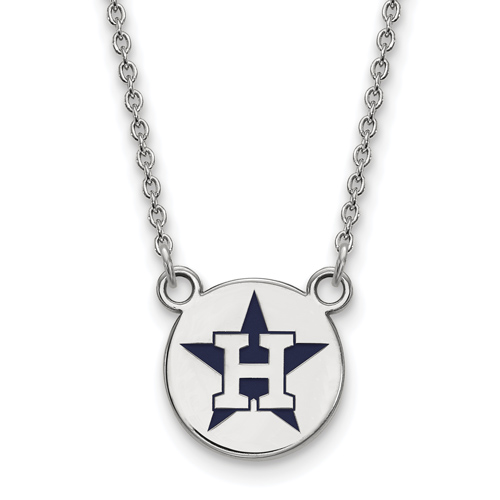 Houston Astros small enamel pendant necklace is made of polished sterling silver. Pendant size: 12mm x 12mm. Pendant is smaller than a dime. Sterling silver 18in cable chain with lobster clasp. Chain width: 1.95mm. Officially licensed MLB jewelry. Weight: 3.5 grams. Made in the USA.