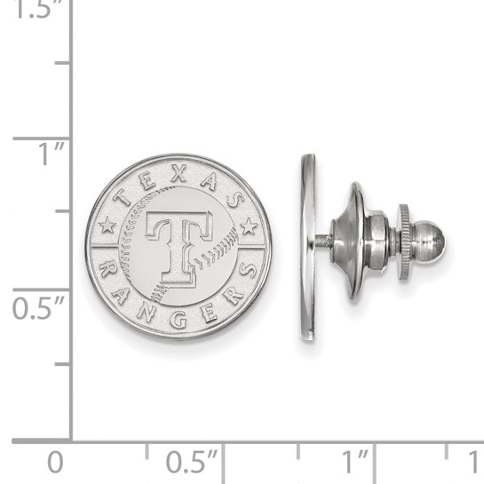 Texas Rangers lapel pin is made of polished sterling silver. Item length: 15mm, width: 15mm. Officially licensed MLB jewelry. Weight: 1.24 grams. Made in the USA.