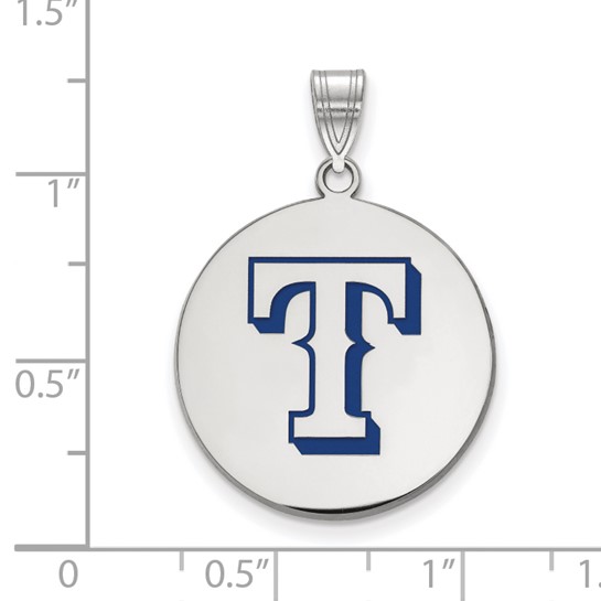 This round Texas Rangers blue enamel pendant is made of polished sterling silver. Item length: 19mm, width: 18mm. Officially licensed MLB jewelry. Weight: 4.8 grams. Made in the USA. Fits up to a 4mm chain.