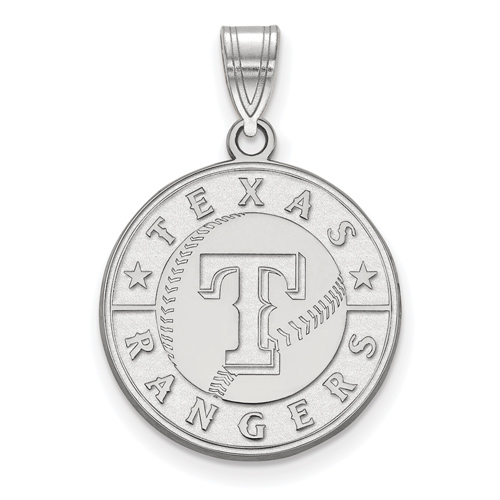 Texas Rangers inset baseball pendant necklace is made of polished sterling silver. Pendant size: 19mm x 18mm. Officially licensed MLB jewelry. Weight: 3.2 grams. Made in the USA.