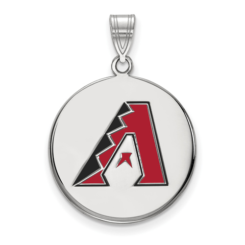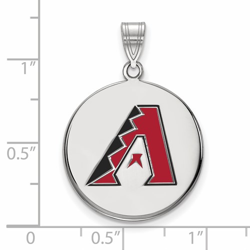 The Arizona Diamondbacks red and black enamel disc pendant is made of polished sterling silver. Item length: 19mm, width: 18mm. Officially licensed MLB jewelry. Weight: 4.5 grams. Made in the USA. Fits up to a 4mm chain.