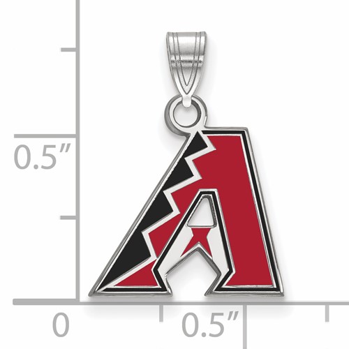 This very small Arizona Diamondbacks A red and black enamel pendant is made of polished sterling silver. Item length: 13mm, width: 14mm. Officially licensed MLB jewelry. Weight: 1.3 grams. Made in the USA. Fits up to a 3mm chain.