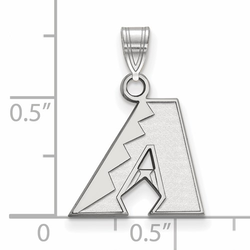 This very small Arizona Diamondbacks A pendant is made of polished sterling silver. Item length: 13mm, width: 14mm. Officially licensed MLB jewelry. Weight: 1.2 grams. Made in the USA. Fits up to a 3mm chain.