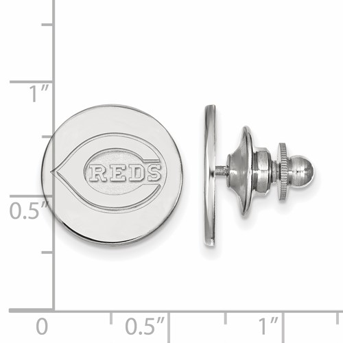Cincinnati Reds lapel pin is made of polished sterling silver. Item length: 15mm, width: 15mm. Officially licensed MLB jewelry. Weight: 1.5 grams. Made in the USA.