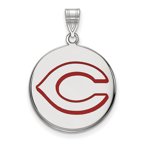 The Cincinnati Reds red enamel disc pendant is made of polished sterling silver. Item length: 19mm, width: 18mm. Officially licensed MLB jewelry. Weight: 4.5 grams. Made in the USA. Fits up to a 4mm chain.