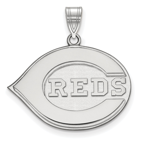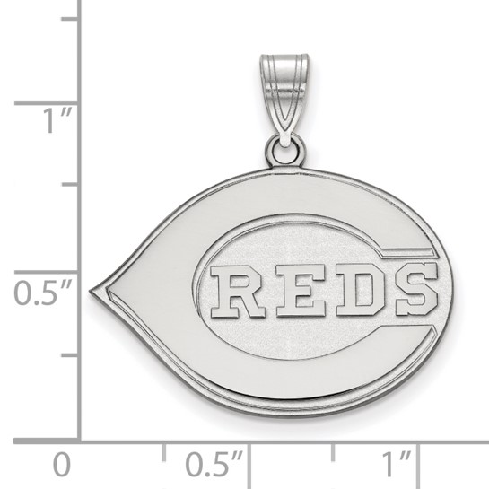 The Cincinnati Reds logo pendant is made of polished sterling silver. Item size: 1in x 3/4in. Officially licensed MLB jewelry. Weight: 4.2 grams. Made in the USA. Fits up to a 4mm chain.