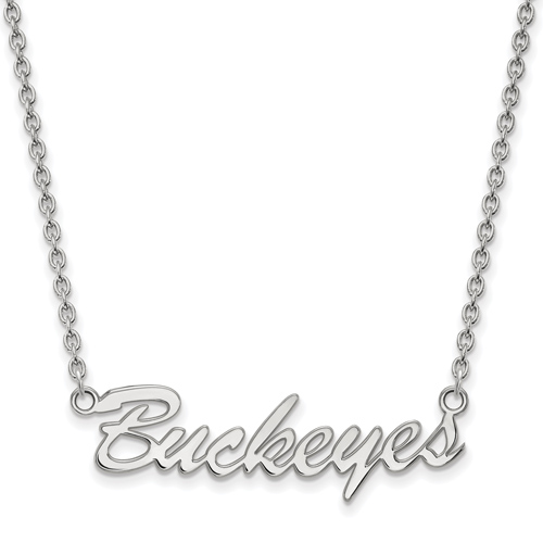 Ohio State University buckeyes pendant is made of polished sterling silver. Item length: 12mm, width: 38mm. Officially licensed jewelry. Weight: 5.91 grams. Made in the USA.