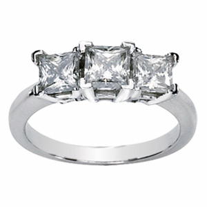 This ring dazzles with one - 5x5mm center square brilliant moissanite stone and two - 4.5x4.5mm square brilliant moissanite stones. Polished 14kt white gold. The equivalent diamond weight is 2 carat total weight. Born from a star this stunning jewel has a brilliant past. Originally discovered in celestial asteroids, Moissanite has a fire, brilliance and luster greater than the finest diamonds.