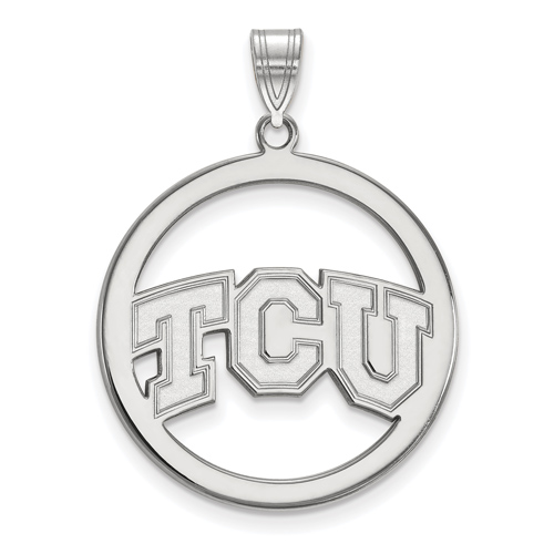 Texas Christian University logo pendant in circle is made of polished sterling silver. Item length: 25mm, width: 24mm. Officially licensed jewelry. Weight: 3.5 grams. Made in the USA. Fits up to a 4mm chain.