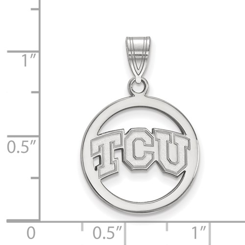 Texas Christian University in circle pendant is made of polished sterling silver. Item length: 18mm, width: 17mm. Officially licensed jewelry. Weight: 2.3 grams. Made in the USA. Fits up to a 4mm chain.