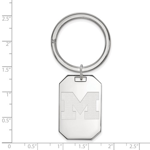 University of Michigan M key chain is made of polished sterling silver. Item length: 32mm, width: 21mm. Officially licensed jewelry. Weight: 13.41 grams. Made in the USA.