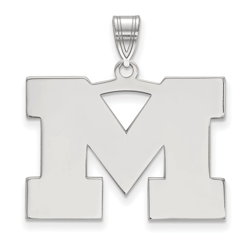 The University of Michigan M pendant is made of polished sterling silver. Item length: 3/4in, width: 1in. Officially licensed jewelry. Fits up to a 4mm wide chain. Weight: 4.8 grams. Made in the USA.