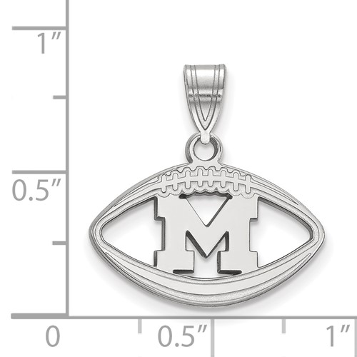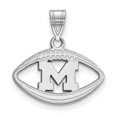 University of Michigan M football pendant is made of polished sterling silver. Item length: 13mm, width: 19mm. Officially licensed jewelry. Weight: 1.6 grams. Made in the USA. Fits up to a 4mm chain.