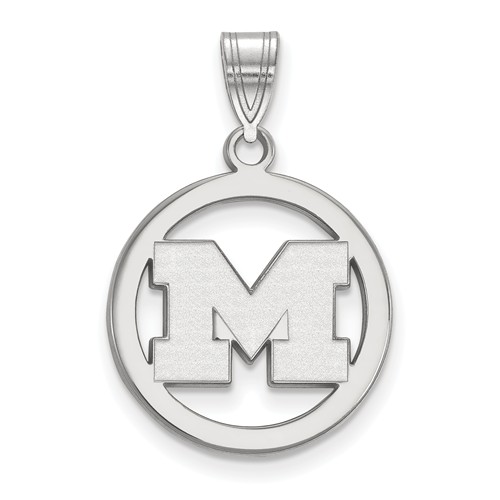 University of Michigan in circle pendant is made of polished sterling silver. Item length: 18mm, width: 17mm. Officially licensed jewelry. Weight: 2.3 grams. Made in the USA. Fits up to a 4mm chain.