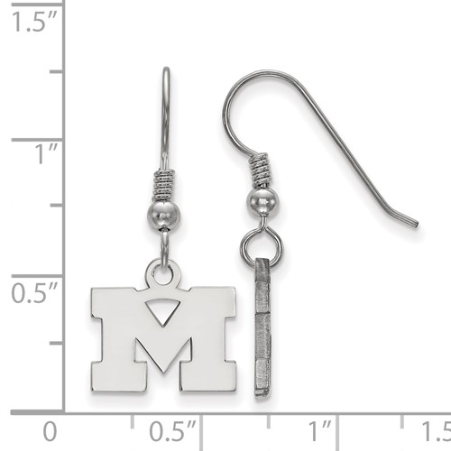 These extra small University of Michigan dangle earrings are made of polished sterling silver. Charm length: 10mm, width: 18mm. Officially licensed jewelry. Weight: 2.3 grams. Made in the USA.