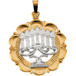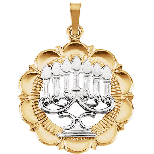 Menorah pendant is made of polished 14k yellow and white gold. Dimensions: 23x21mm. Weighs 2.49 grams. Please note: weight is approximate, actual weight may vary. Chain not included.