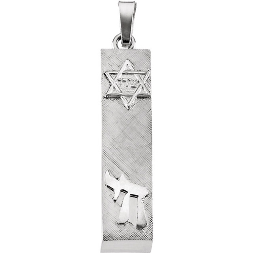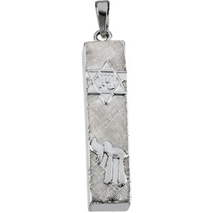This hollow Mezuzah pendant is made of textured and polished sterling silver. Sterling silver 18-inch curb chain has a spring ring clasp. Dimensions: 28mm x 6mm. Weighs 1.57 grams. Please note: weight is approximate, actual weight may vary.