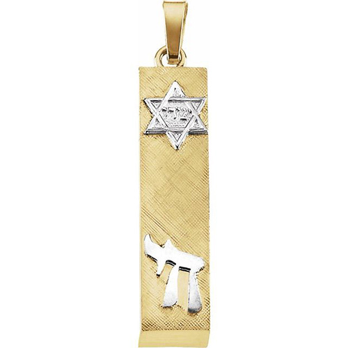 This hollow mezuzah pendant is made of polished 14k yellow and white gold. The pendant has star of David and chai symbols. Dimensions: 28mm x 6mm. Weighs 0.87 grams. Please note: weight is approximate, actual weight may vary. Chain not included. Fits up to a 3mm wide chain.