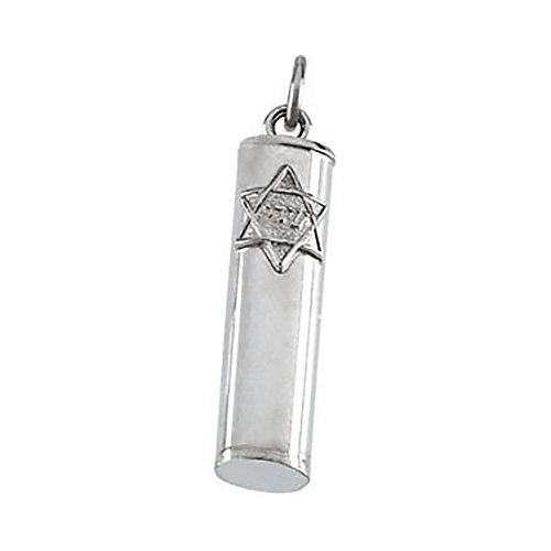 This small mezuzah pendant is made of polished sterling silver. Dimensions: 15x6mm. Ships with a matching sterling silver 18-inch chain [not pictured] Weighs 0.70 grams. Please note: weight is approximate, actual weight may vary.