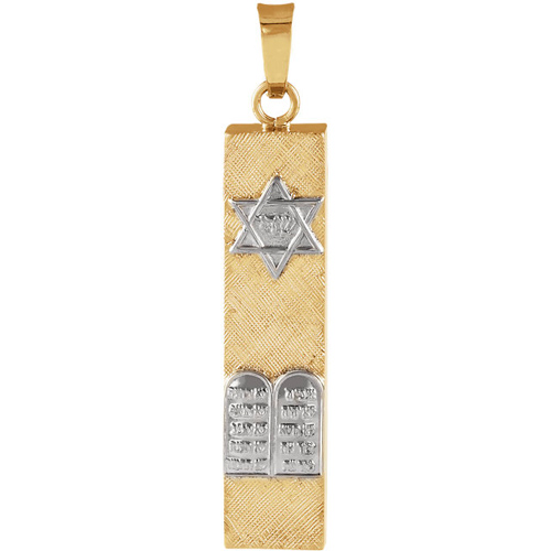 Hollow rectangular mezuzah pendant is made of polished 14k yellow and white gold. Dimensions: 28x6mm. This pendant has the star of David on top and the ten commandments at the bottom. Weighs 1.70 grams. Please note: weight is approximate, actual weight may vary. Chain not included.