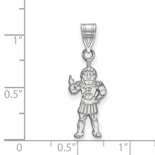 Michigan State University Spartan helmet pendant is made of polished sterling silver. Item length: 3/4in, width: 1/2in. Officially licensed jewelry. Weight: 1.1 grams. Made in the USA. Fits up to a 4mm chain.