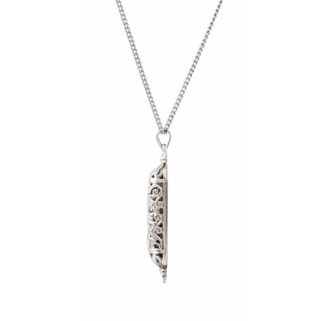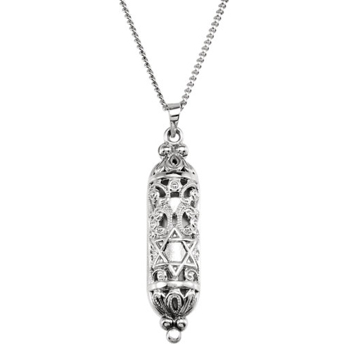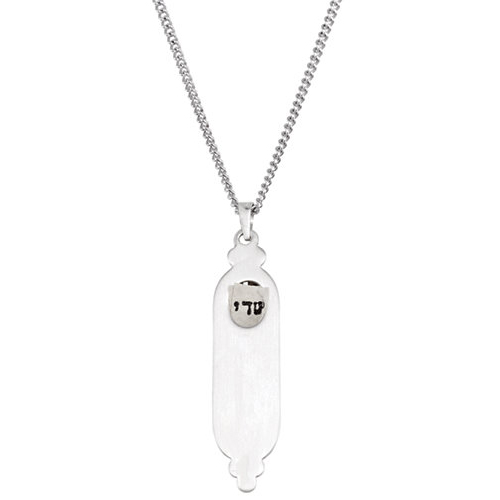 Polished sterling silver mezuzah pendant dangles from a sterling silver 18in chain. Scroll located inside pendant contains the Shema Yisrael, the Jewish prayer. Dimensions: 36mm x 9mm. Weighs 2.41 grams. Please note: weight is approximate, actual weight may vary.