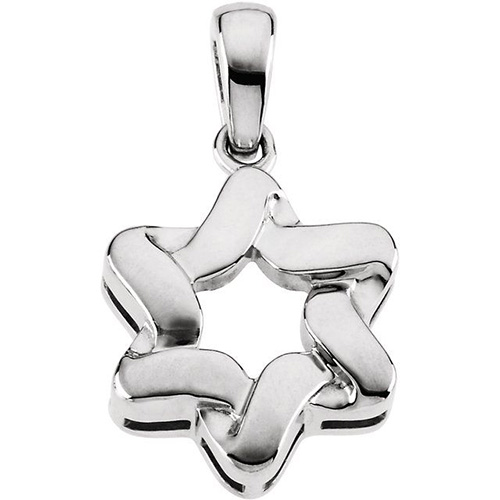 Polished solid 14k white gold Star of David pendant has wrapped edges. Dimensions: 18.5x16.75mm. Fits up to a 2.5mm wide chain. Weighs 6.69 grams. Please note: weight is approximate, actual weight may vary. Chain not included.
