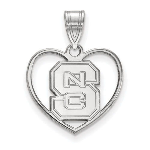 North Carolina State University pendant in heart is made of polished sterling silver. Item length: 15mm, width: 17mm. Officially licensed jewelry. Weight: 1.71 grams. Made in the USA. Fits up to a 4mm chain.