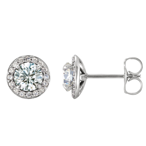 Give your angel these gorgeous 14kt white gold 1 ct tw Forever One moissanite halo earrings with 1/8 ct tw diamond accents. Set with two 5mm round center Forever One moissanite gemstones, E-F color and VS1-VS2 clarity. 32 round genuine diamonds, G-H color, I1 clarity. Friction backs. Approximate weight: 1.4 grams.