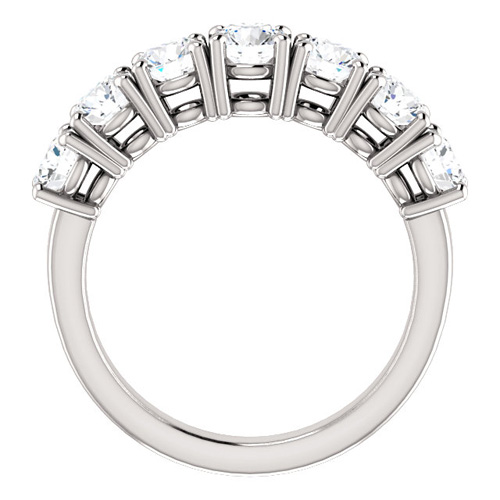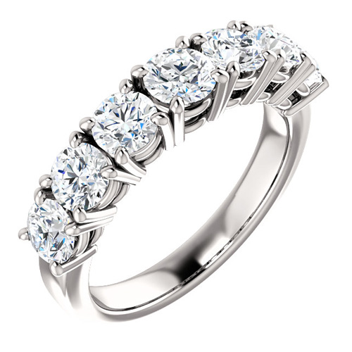 This 14kt white gold 1.8 ct tw Forever One moissanite ring has seven round stones. Set with one 4.5mm round center and six 4.0mm Forever One moissanite gemstones, E-F color and VS1-VS2 clarity. Shoulder width: 3.5mm, tapers to 3.1mm at palm width. Approximate weight: 4.6 grams. Includes Charles & Colvard certificate of authenticity and warranty card.