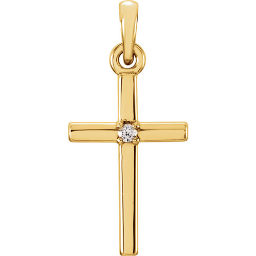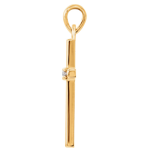 This polished 14kt yellow gold cross pendant has a single .01 ct round diamond accent. Item size: 3/4in x 3/8in. Diamond quality: G-H color, I1 clarity. Fits up to a 2.5mm wide chain. Weighs 1.1 grams. Please note: weight is approximate, actual weight may vary. Chain not included.