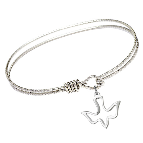A small sterling silver oval Holy Spirit dove charm dangles from this rhodium-plated brass bangle bracelet. Bracelet length: 7 1/4in. Charm size: 5/8in x 3/4in. Made in USA.