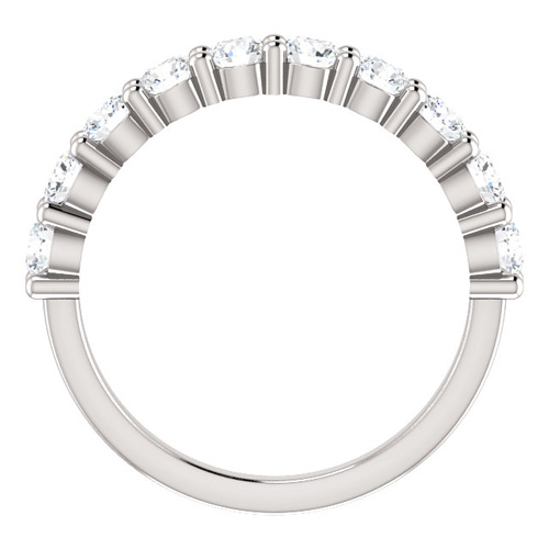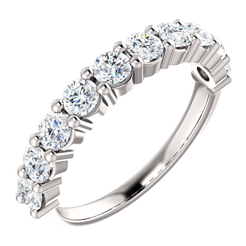 This 14kt white gold Forever One moissanite anniversary band features 10 x 3mm round moissanite gemstones. Each moissanite gemstone shares prongs. Total diamond equivalent weight: 1.0 ct. This item includes a Charles & Colvard moissanite certificate of authenticity and limited lifetime warranty card. Forever One moissanite is comparable in color to a diamond of E-F color and VS1-VS2 clarity.