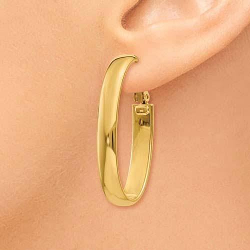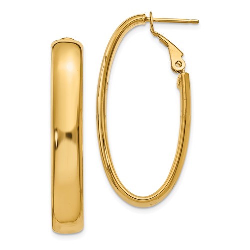 14kt yellow gold oval hoop earrings have a smooth polished finish. Item size: 1 3/8in x 5/8in. Item thickness: 5.5mm. Omega backs. Weight: 2.9 grams. Made in Italy.
